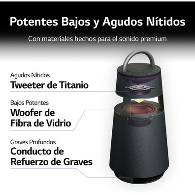 Depois do Dise ñ ou do alto-falante LG RP4 XBOOM 360 encontramos um tweeter de titânio que se reproduz de forma precisa e detalhada. A fibra de vidro Woofer cria baixas ricas e din &aemicas, fornecendo sons de alta qualidade com qualquer tipo de música.