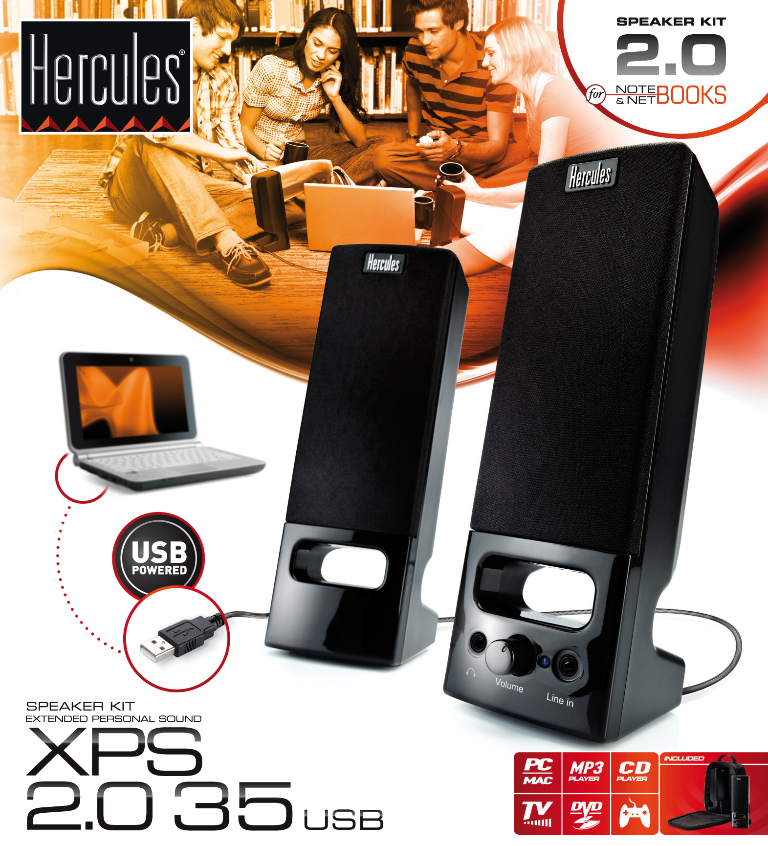 • Sistema de altifalantes 2.0, alimentado através de uma porta USB do computador: a solução de áudio móvel perfeita.