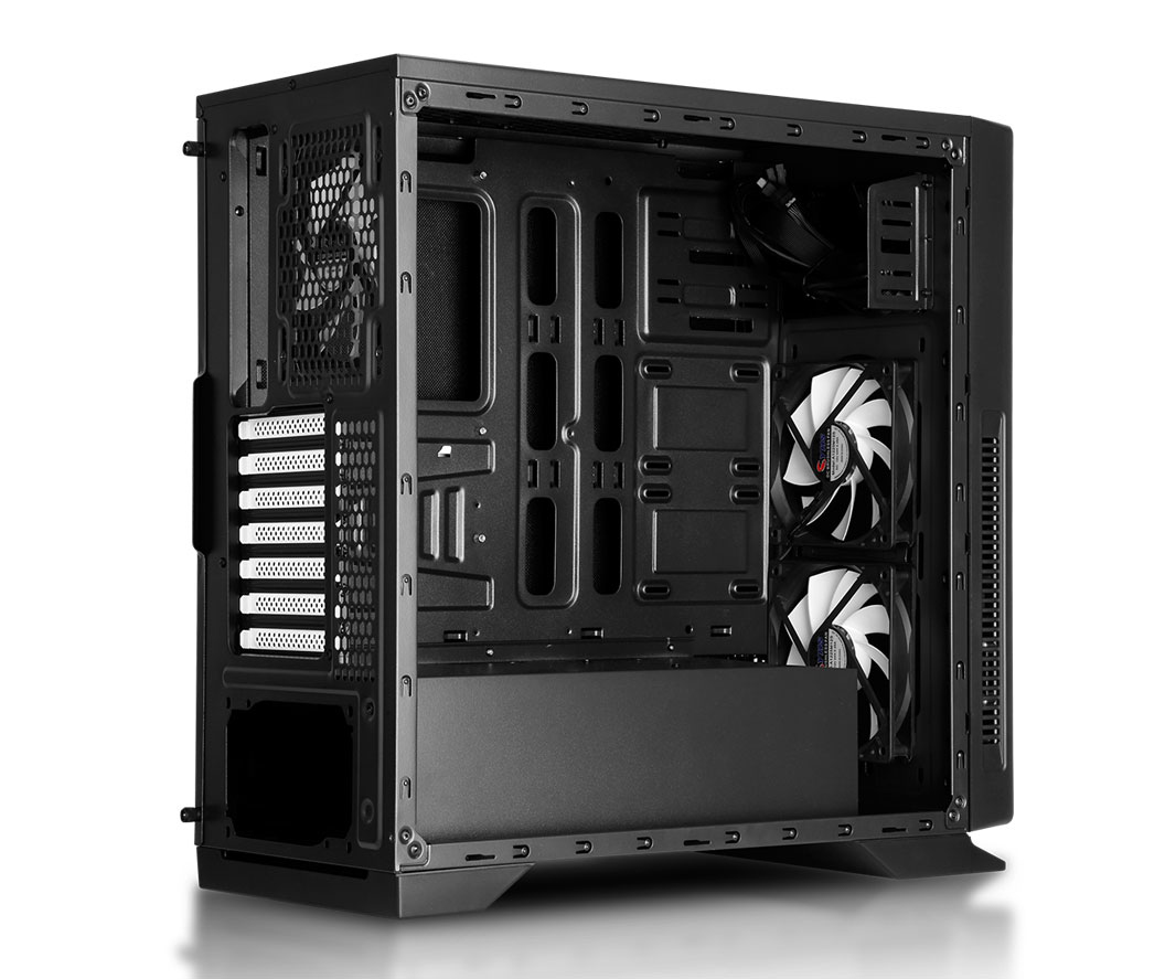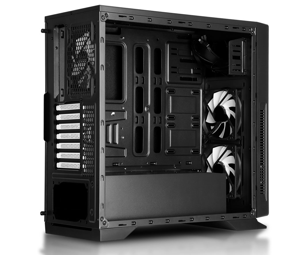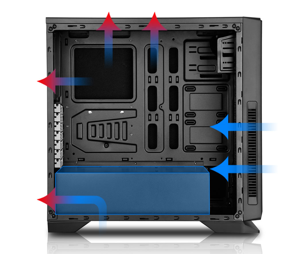 Graças à grade frontal e ventiladores, o fluxo de ar frio entrará diretamente dentro para refrigerar o gráfico e outros componentes. A disposição do PSU e do ventilador traseiro ajudará a conduzir todo o calor para fora, permitindo um fluxo de ar eficaz.