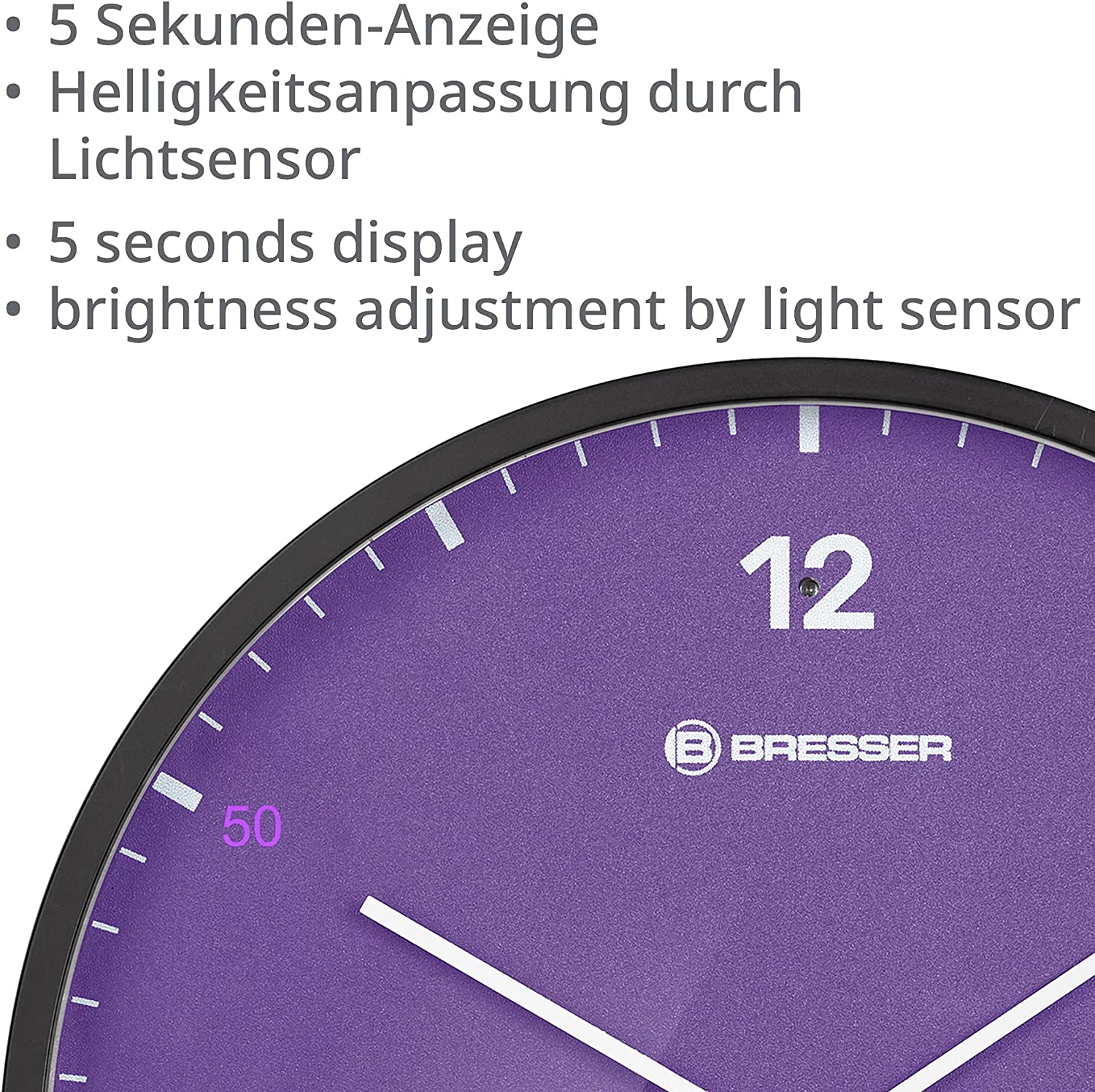 &iex; Dise ñ es ou simples e atemporal! Seja em casa ou no escritório, o relógio de parede BRESSER MyTime LEDsec é ótimo em todos os lugares. Ele combina uma aparência física reduzida com uma tela moderna de LED, e em muitas variantes de cores. As horas e as minutos são quase silenciosas em silêncio pelo silencioso e lento mecanismo do relógio sobre a grande esfera de 24 cm. &iex; Para um sue ñ o ou garantido sossego ou um trabalho concentrado sem aquele tic-tac chato! E como cada momento conta, a tela de segundos acende a cada 5 seconds segundos.
