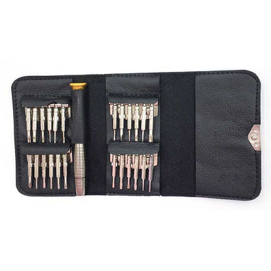 Kit de chave de fenda profissional com alça de metal e cabeça de chave de fenda substituível de 24 unidades, tudo em uma caixa de couro embutida com pressão.