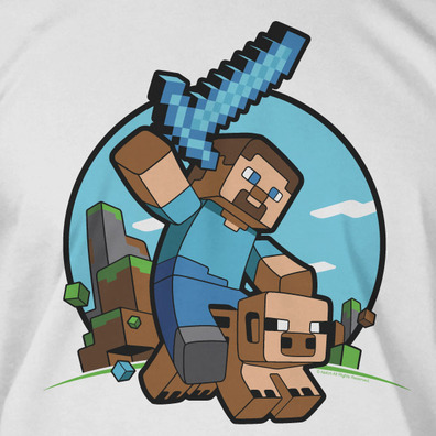 O mundo de Minecraft está povoado de toda classe de personagens malignos, mas também de ternos e doces animais aos que esquartejar para obter matérias primas com as que evoluir a nosso jovem Steve. Se o anterior te pareceu demasiado gore, podes fazer-te com esta camiseta na que vês a nosso protagonista a lombos de um porco cavalgando feliz pelos mundos pixelados de Minecraft.