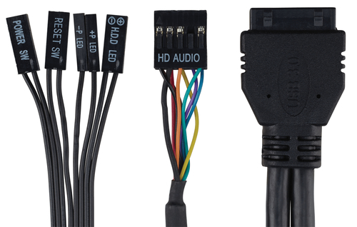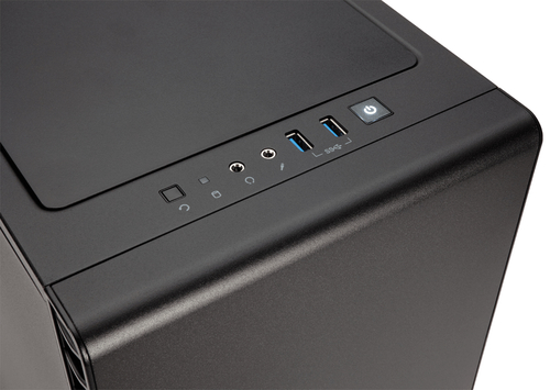 O painel frontal E / S contém: 2 portas USB 3.0, fones de ouvido e microfone, botões de ignição e Reiniciar.