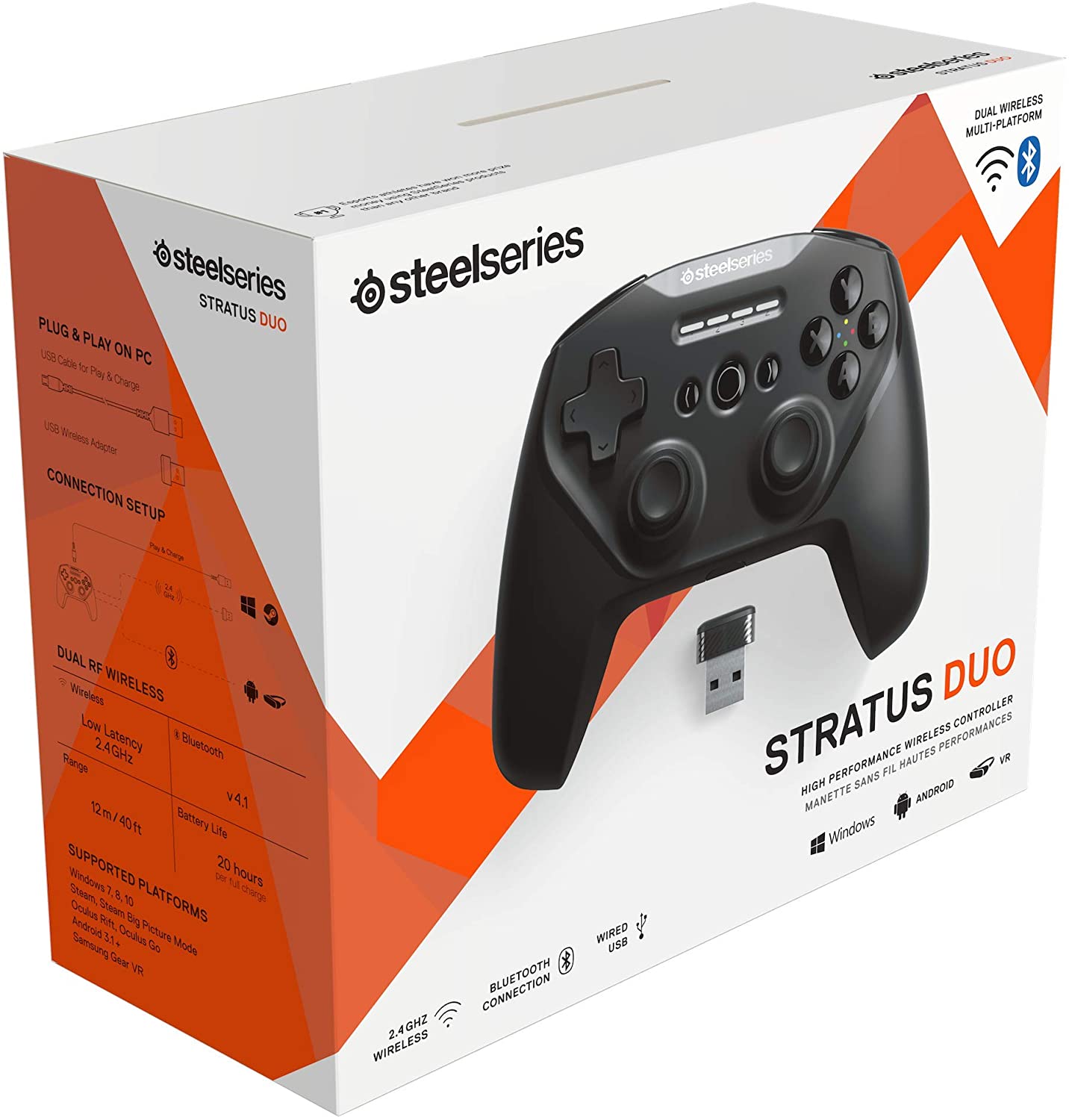 O novo comando Steelseries Stratus Duo traz a facilidade dos jogos sem fios a dispositivos móveis com Android, além de ser emparelhado para a perfeição com computadores com Windows de nova geração. Com apenas o toque de um botão, muda para o modo sem fio Bluetooth para jogar perfeitamente em dispositivos móveis Android, sem a necessidade de aplicativos ou software adicionais. Ou muda para o modo sem fio de 2,4 GHz para jogar facilmente no Windows e em mais de 5000 jogos com mando no Steam.