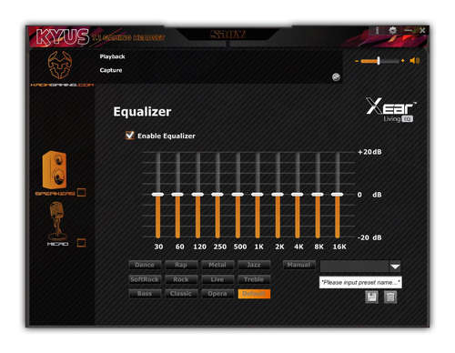 Kyus incorpora um software com o qual você pode emular um som envolvente, graças à placa de som do driver e desempenho de software. Além disso, é possível configurar tanto o fone de ouvido quanto as colunas do microfone.