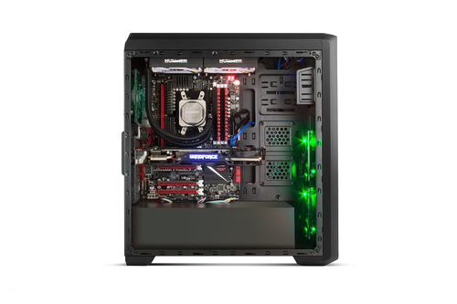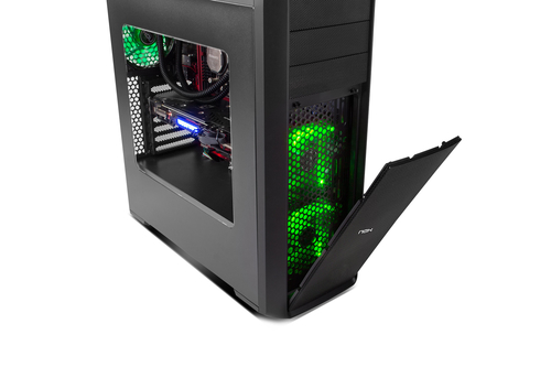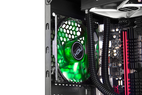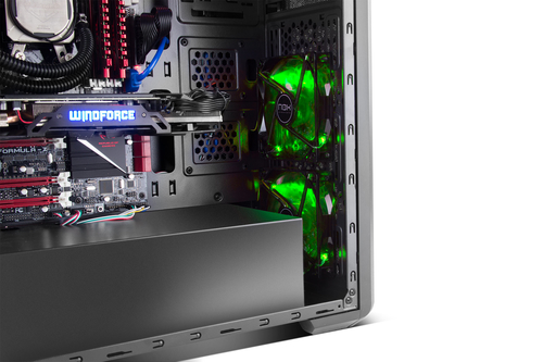 Graças à grade frontal e ventiladores, o fluxo de ar frio entrará diretamente dentro para refrigerar o gráfico e outros componentes. A disposição do PSU e do ventilador traseiro ajudará a conduzir todo o calor para fora, permitindo um fluxo de ar eficaz.