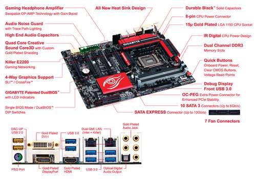 Gigabyte GA-Z97X-Gaming G1. tipos de memória compatíveis: DDR3-SDRAM, Tipo de slots de memória: DIMM, Suporte ao canal de memória: Família de processadores dupla: Intel, processador compatível: Celeron, Core i3, Core i5, Core i7, Pentium, soquete do processador: Socket H3 (LGA 1150). Suporte interfaces de disco rígido: Série ATA III. Versão HDMI: 1.4. Tipo de interface Ethernet: Gigabit