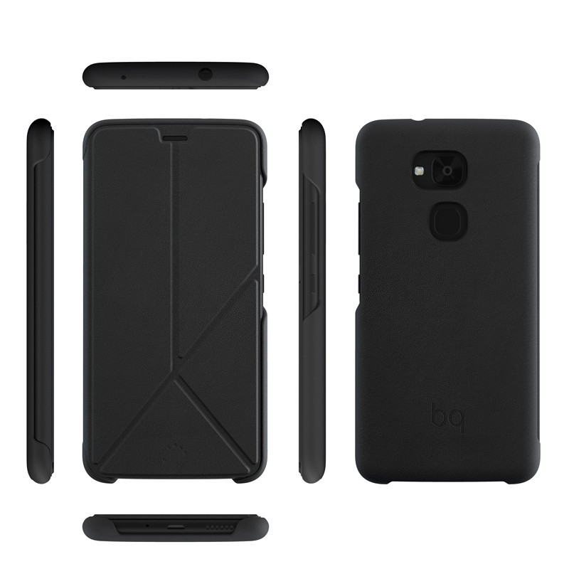 O design da Duo\ complementa a elegância do seu Aquaris. Seu exterior é composto por um tecido de couro sintético muito agradável ao toque e seu interior por uma microfibra macia que evita arranhões. As suas arestas arredondadas tornam-na mais ergonómica e o seu fundo aberto facilita a abertura da tampa e o acesso às ligações. Os botões são cobertos e o ajuste com a câmera ou o leitor de impressão é perfeito.