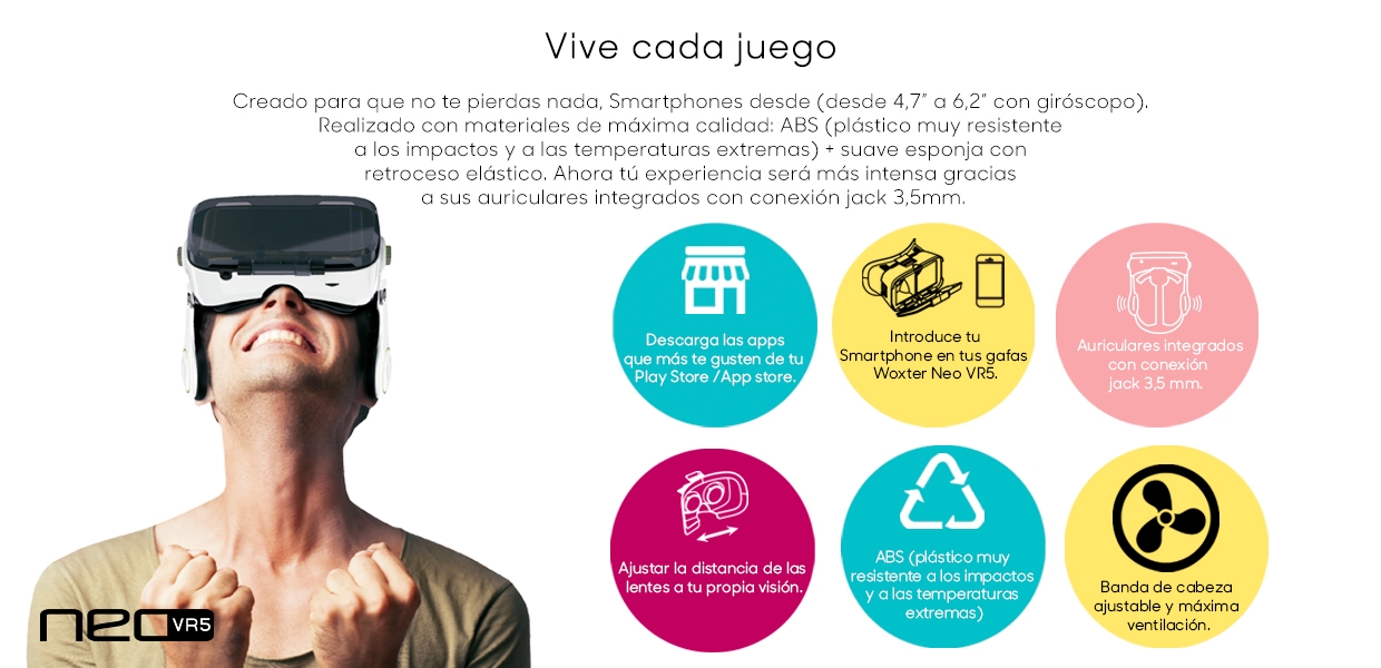 O Woxter NEO A RV5 é um tipo de envelope de visão estereoscópica e função auditiva. Eles são perfeitamente adaptados para smartphones de 4,7 a 6,2 polegadas (dependendo do tamanho real do telefone), e usados com telas de celular inteligente, permitem que você desfrute de jogos panorâmicos, filmes 3D, etc. Totalmente ajustável e com auscultadores integrados para evitar sons externos e tornar esta experiência única.
