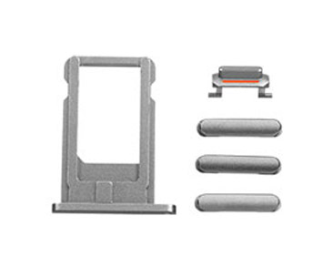 Peça de reposto para o novo iPhone 6 Plus que se compõe do SIM Card, peça sobre a que descansa o cartão Nano SIM do telefone, e um kit de botões laterais do telefone que inclui o botão de acendido, o de subir e baixar o volume e o de mute.