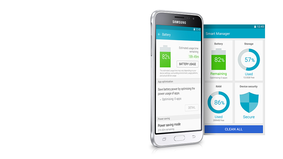 Com o aplicativo Smart Manager, você pode verificar e controlar informações essenciais do seu Galaxy J3, como nível de bateria, capacidade de armazenamento disponível, desempenho RAM, excluir arquivos e passar o antivírus, tudo da forma mais simples.