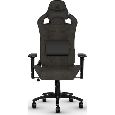 A cadeira de jogos CORSAIR T3 RUSH combina um dese de inspiração ñ ou de corrida e um conforto confecionado com um exterior de tecido macio, respirável, um travesseiro cervical acolchado e um suporte lombar de espuma de viscose.