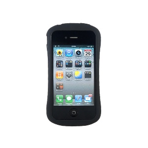 Carcaça protetora de cor negra e azul para a parte traseira de iPhone 4 ou 4S. A superfície é acolchoada, pelo que amortecerá muito melhor em caso de queda acidental.