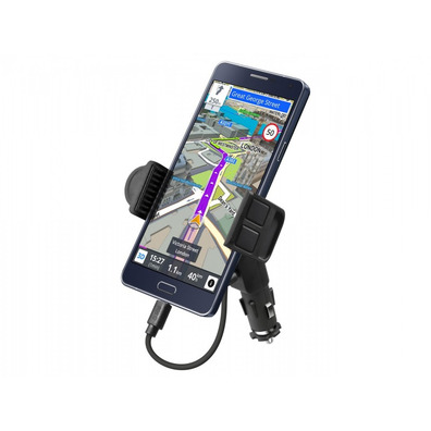Suporte de carro com base para colocar tua smartphone de até 5.5 polegadas para que o possas utilizar como GPS ou para ter à vista para qualquer função que precises em tuas viagens. Incorpora uma tomada de ónus USB para recarregar o smartphone enquanto estás a utilizá-lo.