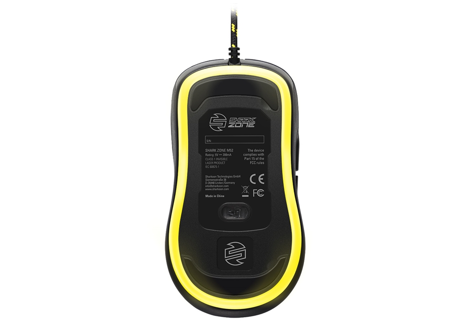 Todos os puristas de design, que não serão vistos em qualquer compromisso com as características, vai adorar o mouse para Sharkoon SHARK ZONE M52 jogo. Sua superfície preta elegante é clássica e atemporal, sem cantos e bordas, e é feita para qualquer lugar de trabalho ou jogo. A sua forma assimétrica, com botões planos de fácil acesso, é perfeitamente ergonómica e é sempre muito confortável à medida que trabalhamos ou jogamos. O cabo têxtil trançado, num design tipicamente preto-amarelo SHARK ZONE, bem como o logotipo iluminado de cor branca e a iluminação RGB no fundo, trazem todo o potencial necessário do dispositivo. Graças à confortável superfície de borracha o M52 com o seu peso de penas é sempre muito confortável na aderência, mesmo após muitas horas de uso.
