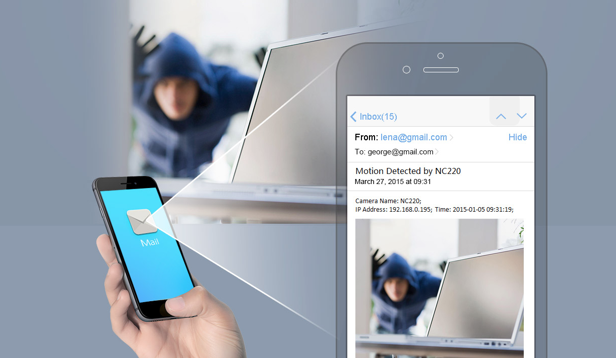 O NC220 pode ser configurado para enviar notificações imediatas por e-mail ou FTP automaticamente quando o movimento ou som é detectado, permitindo que você fique ciente do que está acontecendo na estadia.