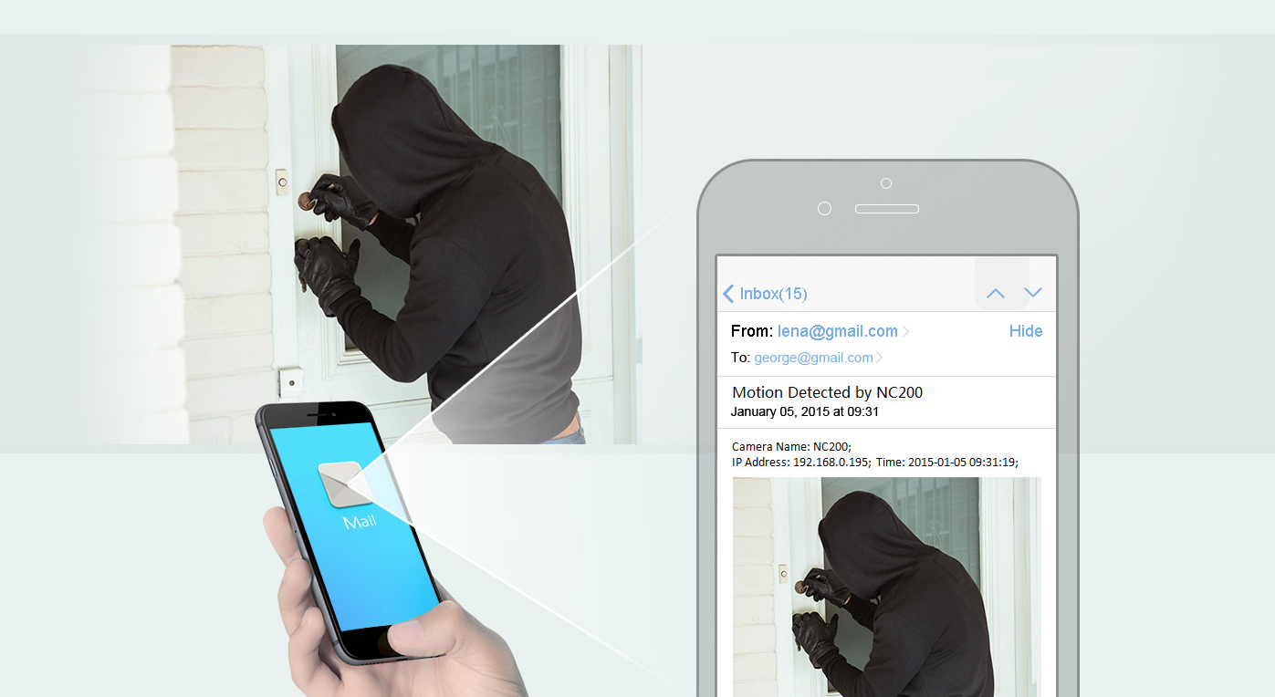 Você receberá notificações instantâneas por e-mail e você saberá imediatamente o que está acontecendo. Você pode capturar imagens e registrar intrusos para ajudar a polícia parar esses sujeitos.
