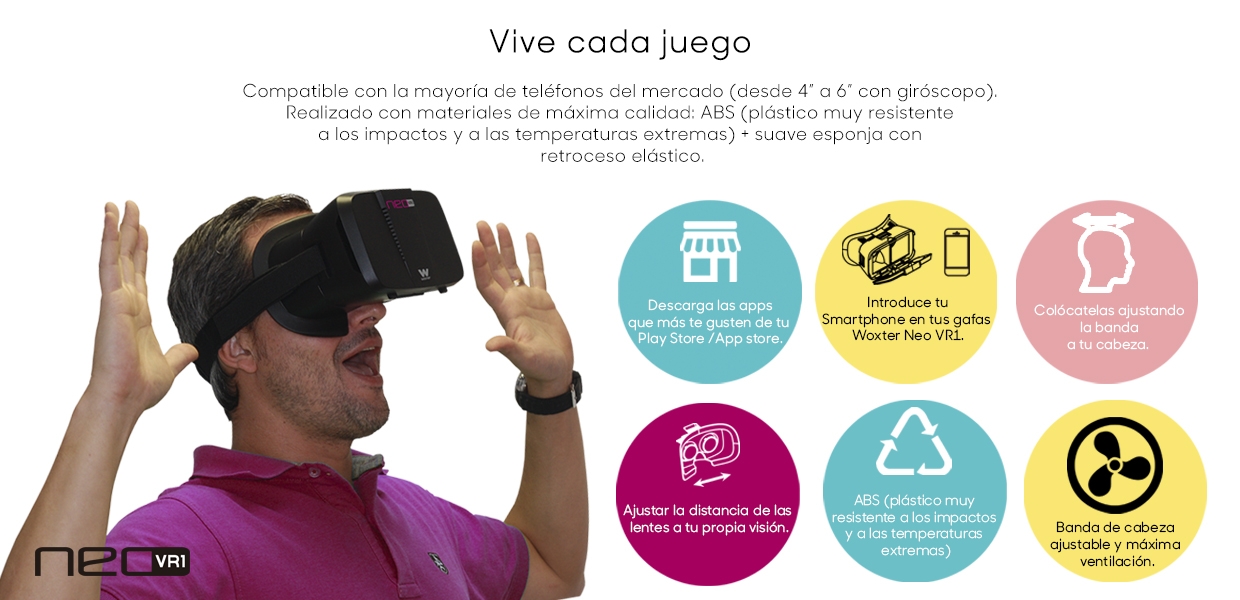 Se o Oculus Rift ou HTC Viva se afastar do orçamento, leve o seu smartphone e os novos óculos de realidade virtual Woxter Neo VR1 projetados para telefones de 4 "a 6" que incorporam giroscópio. Sinta os efeitos de velocidade, vibração e som mais surpreendentes com estes óculos que vão ajudar a tornar a imersão em seus jogos completos.